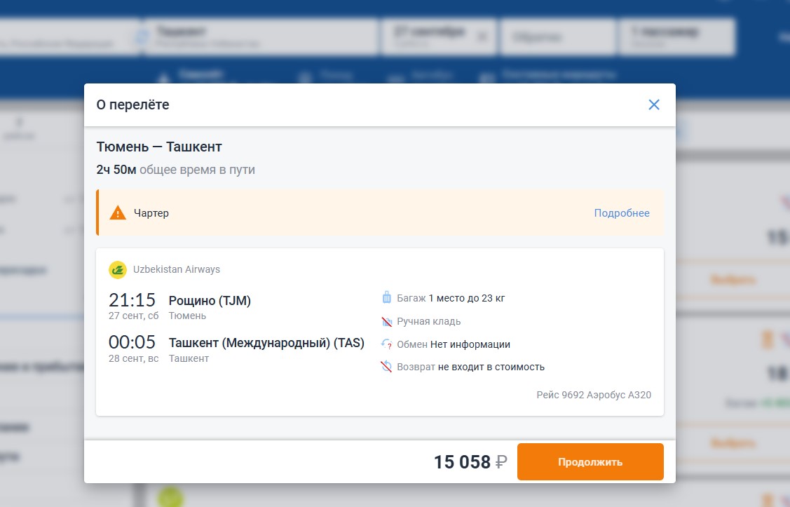 C 27 сентября Uzbekistan Airways добавит еще один регулярный рейс Тюмень-Ташкент по субботам.